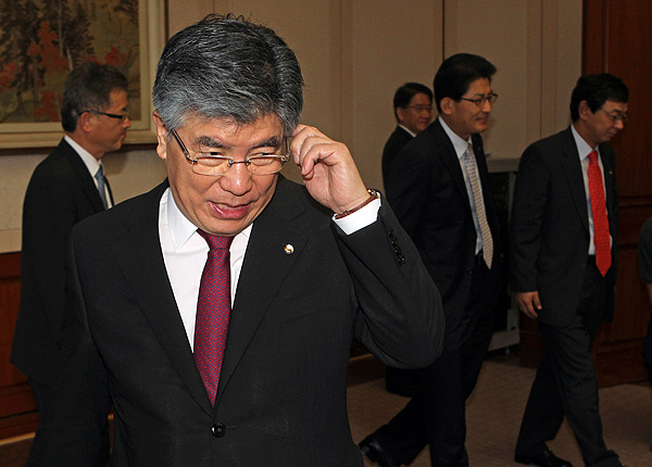 김중수 한국은행 총재가 18일 서울 소공동 한국은행에서 열린 경제동향 간담회에서 참석자들과 인사를 나눈 뒤 테이블로 향하고 있다.