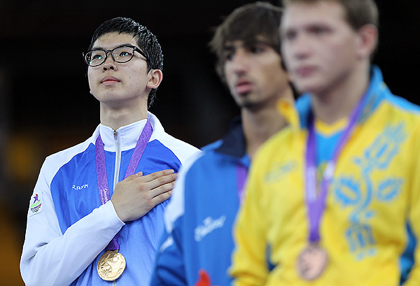 지난 18일 오후 싱가포르 인터네셔널컨벤션센터에서 열린 제1회 청소년올림픽 태권도 남자 73kg에서 금메달을 딴 한국 김진학이 애국가 울리자 국기에 대한 경례를 하고 있다.