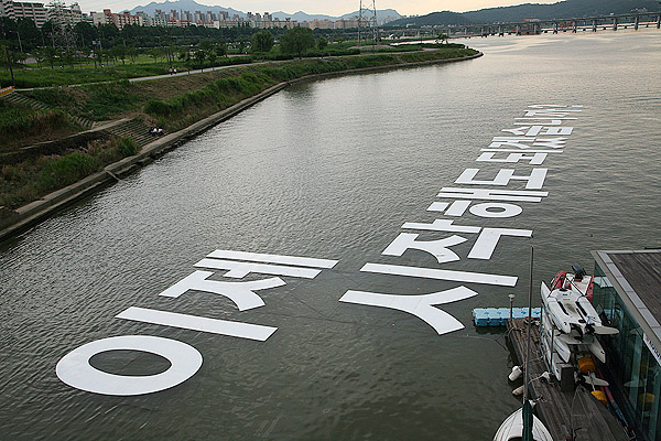 KT는 지난 7월 31일부터 TV를 통해 선보인 ‘올레(olleh)’ 광고 런칭편에서 한강에 띄운 100m짜리의 거대한 글씨가 대한민국 최대 광고표시물로 한국 최대기록을 수립했다고 19일 밝혔다. 사진은 물위에 띄운 국내 최대 광고로 한국기록에 등재된 KT의 올레 광고의 촬영 장면.