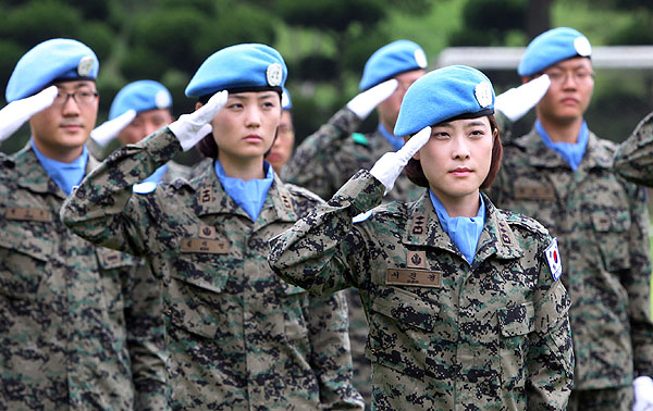 지진 피해를 당한 아이티 재건을 위해 교대 병력으로 파병되는 단비부대 2진 환송식이 27일 오후 인천 계양구 국제평화지원단에서 열려 장병들이 국기에 대한 경례를 하고 있다.