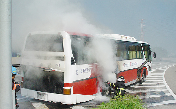 27일 오전 청주시 흥덕구 석소동 청주IC 부근에서 김모(40)씨가 몰던 리무진버스 뒷바퀴가 불에 타 소방관들이 진화작업을 하고 있다.