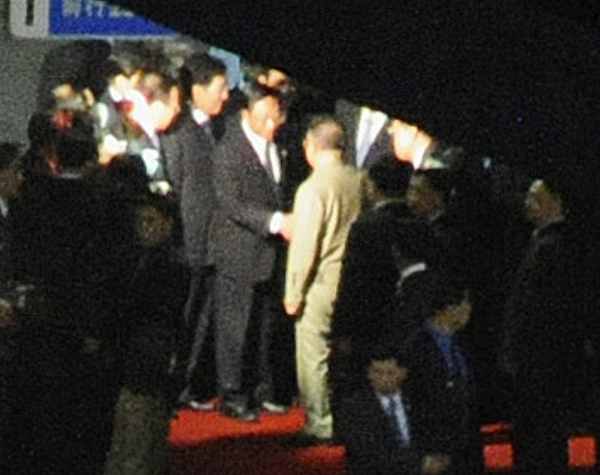 28일 밤 중국 창춘역에 깔린 붉은색 융탄 위에서 중국측 요인으로 추정되는 인물과 악수를 하는 북한 김정일 국방위원장으로 추정되는 인물.