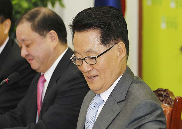[포토]밝게 웃는 민주당 박지원 비대위 대표