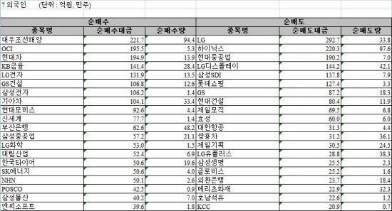 종목별로는 대우조선해양(221억원)과 OCI(195억원), 현대차(194억원), KB금융(141억원), LG전자(131억원) 등은 순매수 했다. 대우조선해양은 신규수주 호조에 따른 실적개선 기대감에 외국인들의 매수세가 몰리면서 3.96% 상승하며 52주 신고가를 경신했다.
