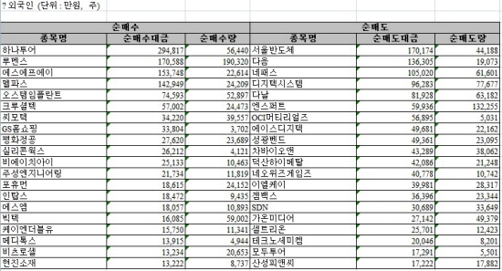 반면 서울반도체(17억원), 다음(13억원), 네패스(10억원), 디지텍시스템(9억원), 다날(8억원) 등은 순매도했다. 서울반도체는 LED 공급과잉 우려에 외국인들의 매물을 출회에도 불구하고 개인들의 저가 매수세 유입에 힘입어 0.80% 상승했다.