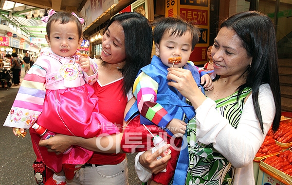 시장경영진흥원이 민족 최대 명절인 추석을 2주 앞두고 다문화가족 엄마와 아이들을 초청해 7일 오전 종로광장시장을 방문하여 한국의 명절 및 음식 문화를 체험하고 있다.