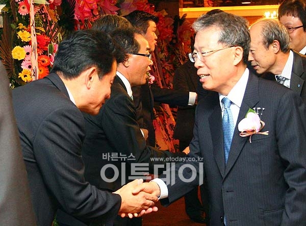 윤용로 기업은행장이 4일 오후 소공동 롯데호텔에서 열린 이투데이 창간 기념 행사에 참석하여 축하의 악수를 건네고 있다.