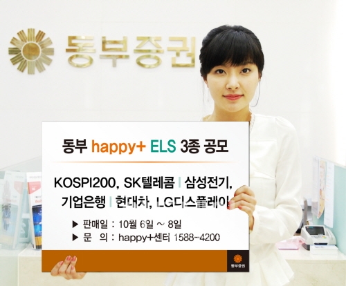 ‘동부 happy+ 파생결합증권(ELS) 제390회’는 KOSPI200지수와 SK텔레콤을 기초자산으로 하는 원금보장형 상품이다. 3년 만기 상품으로 6개월 주기의 조기상환 평가일 및 만기평가일에 기초자산의 종가가 최초기준가격의100%이상이면 연 7.2%의 수익이 지급된다. 만기평가 시 최초기준가격의 100% 이하로 하락한 경우에도 원금 을 보장한다.