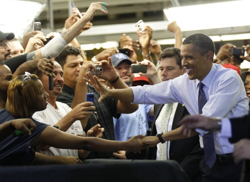 ▲버락 오바마 미국 대통령이 5일(현지시간) 포드 시카고 공장을 찾아 근로자들과 악수하고 있다. 시카고/AP연합
