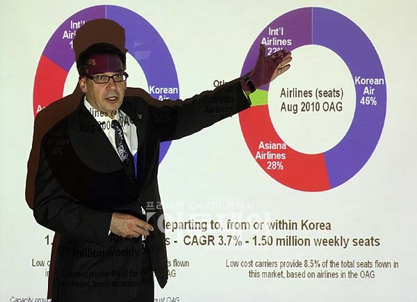 보잉 상용기 랜디 틴세스 마케팅 부사장이 7일 오전 소공동 조선호텔에서 열린 기자간담회에서 '2010-2029 항공시장전망'을 주제로 전 세계 및 동북아시아 지역의 항공시장 전망을 발표하고 있다.