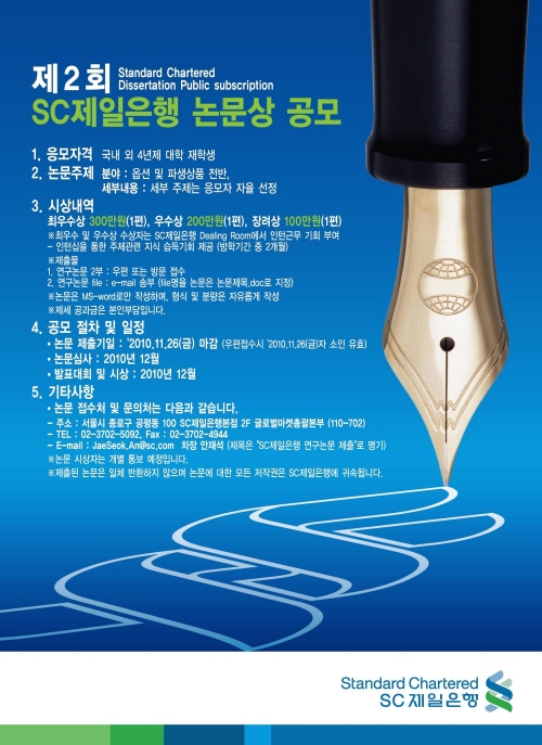 스탠다드차타드제일은행(SC제일은행) 글로벌 마켓총괄본부는 제2회 대학생 논문상 공모전을 실시한다고 12일 밝혔다.
