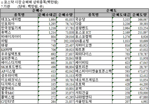 기관은 국순당(53억원), 다음(32억원), 성광벤드(29억원), 포스코ICT(21억원), 포스코켐텍(12억원) 등을 순매도했다. 기관은 막걸리 대표주인 국순당을 실적 우려로 인해 최근 나흘째 대거 순매도하면서 주가 역시 큰 폭으로 떨어지고 있다.