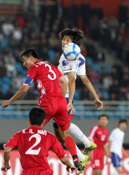 지난 14일 오후 (한국시간) 중국 산둥성 쯔보 스포츠센터 스타디움에서 열린 2010 아시아축구연맹(AFC) U-19 선수권대회 준결승전 남북대결에서 한국 이광진(맨 위)이 상대 장성혁과 경합을 벌이며 헤딩슛을 연결하고 있다. 이날 한국은 북한에게 0-2로 져 결승진출에 실패했다.