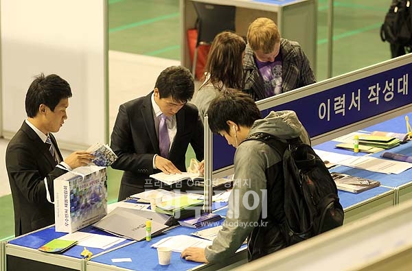 19일 서울 한양대학교에서 열린 '2010우수벤처 채용박람회'에서 구직자들이 이력서를 작성하고 있다.