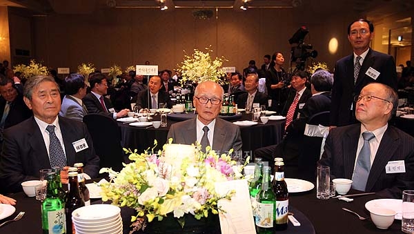 김우중 전 대우그룹 회장(가운데)이 19일 오후 AW컨벤션센터에서 열린 대우세계경영연구회 정기총회 및 창립기념식에 참석하고 있다.