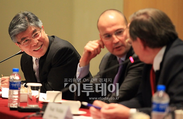 바젤위원회 규제개편 관련 공동 기자회견이 19일 오후 서울 삼성동 코엑스에서 열린 가운데 김중수 한국은행 총재가(왼쪽) 누트 웰링크 바젤위원회 의장을 향해 미소 짓고 있다. 이날 바젤은행감독위원회(BCBS)는 G20 서울 정상회의의 성공적 개최를 위해 BCBS의 금융규제 개혁 방안 마무리와 자본규제 강화와 함께 유동성비율 규제를 확정할 계획이다.