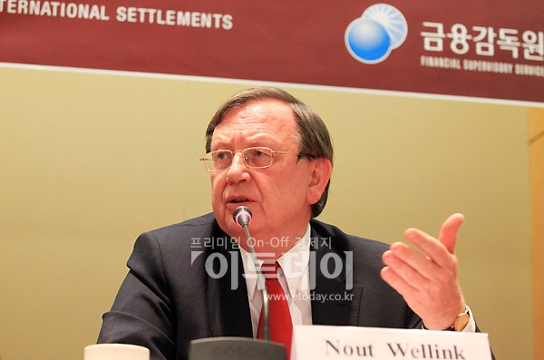 바젤위원회 규제개편 관련 공동 기자회견이 19일 오후 서울 삼성동 코엑스에서 열린 가운데 누트 웰링크 바젤위원회 의장이 발언을 하고 있다. 이날 바젤은행감독위원회(BCBS)는 G20 서울 정상회의의 성공적 개최를 위해 BCBS의 금융규제 개혁 방안 마무리와 자본규제 강화와 함께 유동성비율 규제를 확정할 계획이다.