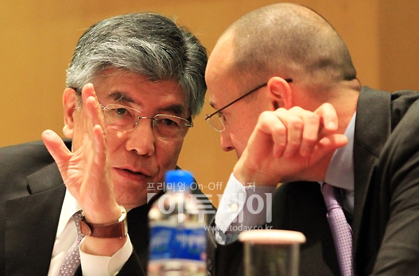 바젤위원회 규제개편 관련 공동 기자회견이 19일 오후 서울 삼성동 코엑스에서 열린 가운데 김중수 한국은행 총재와(왼쪽) 스테판 월터 사무총장이 의논을 하고 있다. 이날 바젤은행감독위원회(BCBS)는 G20 서울 정상회의의 성공적 개최를 위해 BCBS의 금융규제 개혁 방안 마무리와 자본규제 강화와 함께 유동성비율 규제를 확정할 계획이다.