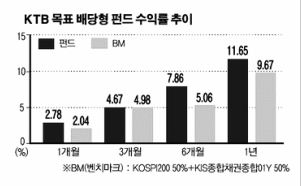 KTB자산운용이 운용하고 있는 ‘KTB목표배당형증권투자신탁[주식혼합]’는 목표수익률 7%를 올릴 때마다 결산을 통해 수익금을 현금으로 배당해준다. 따로 환매할 필요도 없고 재투자를 위해 따로 다른 펀드에 가입할 필요도 없는 점이 장점이다.