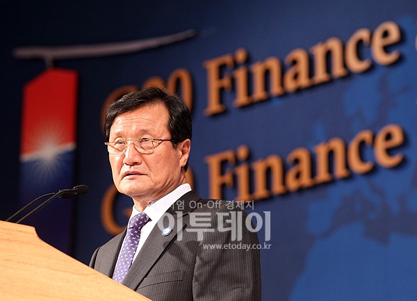 윤증현 기획재정부 장관이 23일 오후 경주 현대호텔 미디어센터에서 열린 공식 기자회견에서 경주 코뮈니케에 대해 설명하고 있다.