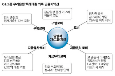 26일 금융권 등에 따르면 검찰은 우리은행이 실무진의 반대에도 불구하고 C&그룹에 수백억 원의 대출을 내준 것으로 보고 C&그룹과 우리은행 간의 유착 의혹을 집중적으로 살펴보고 있다. 실제 C&그룹이 워크아웃(기업개선작업)에 들어가기 불과 두 달 전인 2008년 10월 현재 C&그룹의 전체 대출액 1조3052억원 중 17%에 달하는 2247억원을 우리은행이 대출해 줬다.