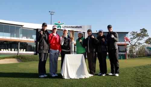 ▲미셸 위 등 톱스타들이 29일 스카이72GC에서 개막하는 LPGA하나은행 챔피언십 우승트로피앞에서 우승을 다짐하고 있다. 사진=JNA정진직 포토