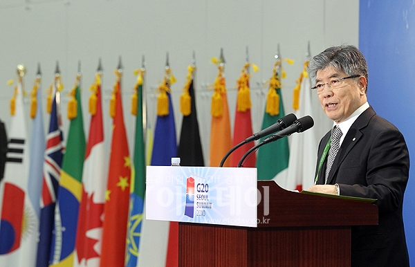 김중수 한국은행총재가 11일 오전 서울 삼성동 G20 회의장내 미디어 센터에서 '글로벌 금융위기 이후 한국 경제'에 대해 브리핑을 하고 있다.