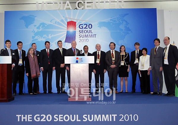 서울 G20 정상회의 둘째날 인 12일 오전 삼성동 코엑스 미디어센터에서 중소기업자금대회 각국의 최종 우승자들이 기념사진 촬영을 하고 있다.