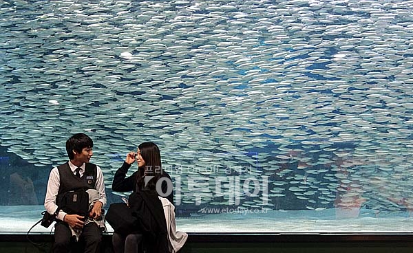 코엑스 아쿠아리움에 17일 오후 약 2만 여 마리의 대규모 정어리떼가 들어와 관람객들이 정어리떼의 화려한 군영을 관람하고 있다.