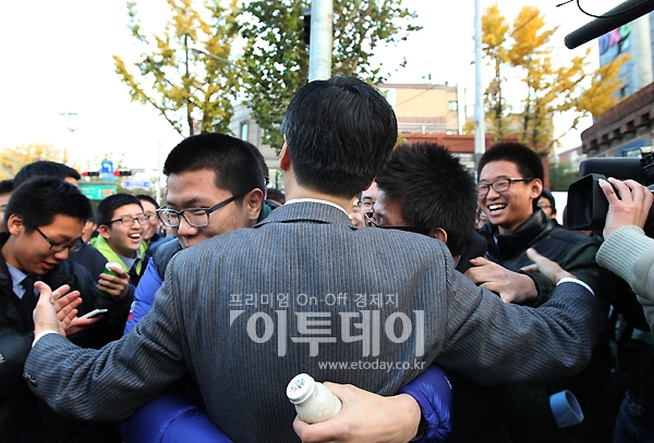 곽노현 서울시교육감이 2011학년도 대학수학능력시험일인 18일 오전 용산고등학교에 방문하자 학생들이 몰려들며 감사의 포옹을 하고 있다.