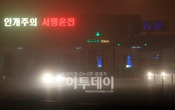 전국대부분 지방이 안개가 끼어있다. 곳에 따라 가시 거리가 100m도 채 되지 않은 지역이 있어 출근길 안전운전이 요구된다. 아침 일찍 출근을 서두르는 차량들이 1일 오전 안개낀 경기도 의왕 톨게이트를 빠져나오고 있다.