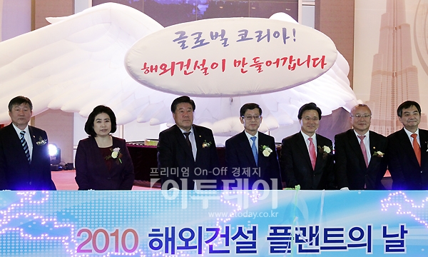김황식 국무총리(가운데)가 7일 오후 서울 논현동 건설회관 대강당에서 열린‘2010 해외건설 플랜트의 날’기념식에 참석해 한나라당 박순자 의원, 민주당 최규성 의원, 이재균 해외건설협회장 등과 함께 기념촬영을 하고 있다.