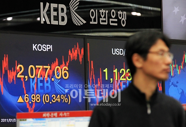 코스피지수가 또 다시 최고가를 향해 나아가고 있다. 4일 오전 외환은행 딜링룸 시황판의코스피 지수가 전날에 비해 6.98 포인트 오른 2077포인트를 기록하고 있다.