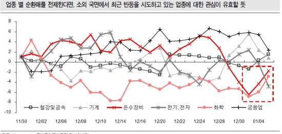 조 연구원은 "주요 업종들간의 상관 계수 행렬을 구해 보면 업종별 순환매가 활발하게 이뤄 지고 있다"며 "11월 이후 시작된 상승 국면에서 주요 업종들의 지수 움직임 간의 상관계수는 주로 마이너스를 기록하고 있다"고 설명했다.