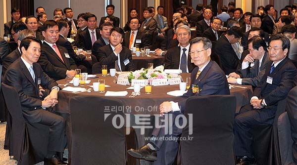 허원준 한국석유화학공업협회 회장(앞줄 첫번째)과 석유화학업계 CEO들이 6일 오전 장충동 신라호텔에서 열린 2011년 석유화학업계 신년인사회에 참석해 조석 지식경제부 성장동력실장의 인사말을 경청하고 있다.