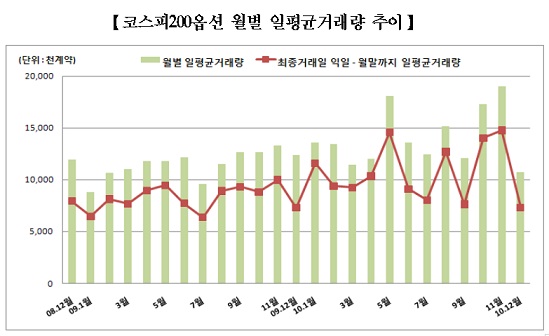 6일 한국거래소에 따르면 지난 12월 코스피200옵션 일평균거래량은 1074만9000계약으로 지난해 월별 일평균거래량 중 최저를 기록했다. 지난해 11월까지 평균거래량(1437만3000계약)의 약 75% 수준이다. 특히 최종거래일(12월9일) 이후 일평균거래량(730만5000계약)은 급감세를 보였다.