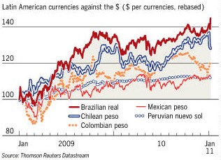지난주 브라질 중앙은행은 통화절상과 인플레이션 압력이 커지면서 시중 은행들의 지급준비율을 오는 4월부터 인상해 유동성을 조이는 한편 핫머니 차단을 위해 사상 처음 역내 외환시장에서 공매도 거래를 금지하는 조치를 단행했다.