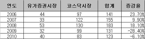 10일 한국예탁결제원에 따르면 지난해 상호를 바꾼 회사는 123사로 2009년 131사 보다 8사(6.1%)가 감소했다. 증권시장별로는 유가증권시장이 40사로 2009년 대비 25% 증가했으며, 코스닥시장은 83사로 2009년 대비 16.2% 감소했다.