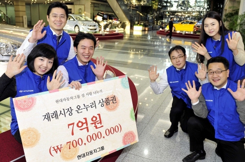 한편 현대차는 2009년부터 명절을 맞아 재래시장 상품권을 구입해 임직원 봉사단이 소외이웃에게 전달해 왔다. 특히 올해는 현대차가 구입한 상품권 중 2억 원을 협력사 임직원 봉사단이 전달하는 등 참여 범위를 협력사로 넓혔다.