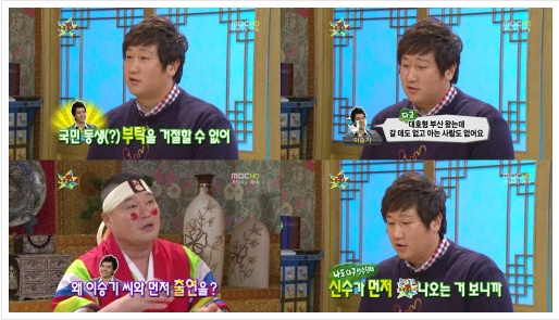 이대호는 12일 오후 방송된 MBC '황금어장-무릎팍도사'에 출연해 "'무릎팍도사'에 먼저 출연하기로 해놓고 왜 타 방송국의 '1박 2일'에 먼저 출연했느냐"는 질문에 "사실 '무릎팍도사'부터 먼저 나오려고 했는데 갑자기 승기에게서 연락이 왔다"며 "국민 동생의 부탁을 제가 거절하면 안되지 않느냐"고 답했다.