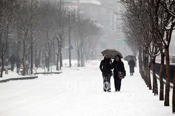 서울과 경기도 지역에 대설주의보가 발령된 23일 오후 시민들이 폭설이 내리고 있는 서울 청계천 눈길을 걷고 있다.