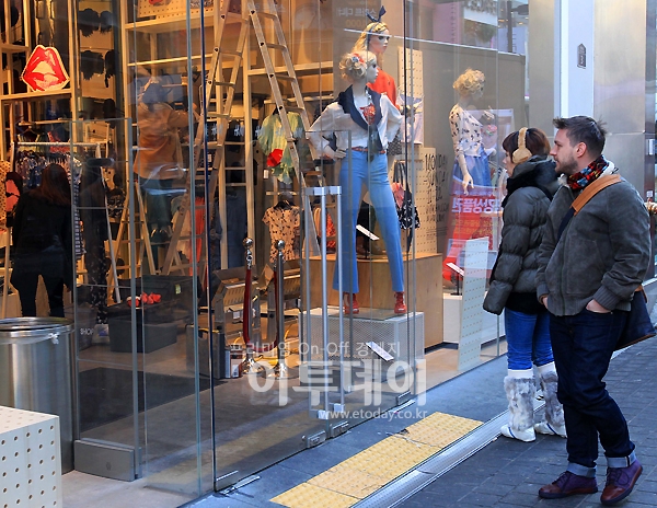 연일 이어지는 추위 속에서 의류매장은 봄맞이를 마쳤다. 영하의 추위에 두터운 옷과 머플러로 무장한 외국인 관광객들이 26일 오전 서울 명동의 의류매장에 걸린 봄 옷들을 바라보며 따뜻한 봄이 오기를 바라고 있다.