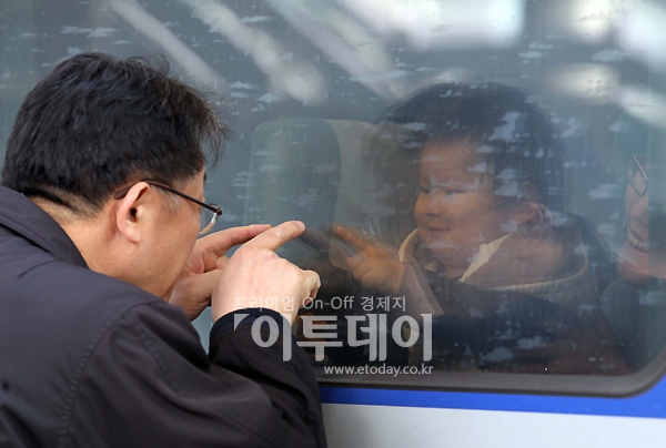 설연휴를 앞둔 31일 오후 엄마와 함께 미리 귀성길에 오른 어린아이가 창밖의 아빠와 인사를 나누고 있다.