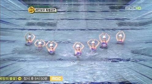 이날 레인보우 멤버들은 4개월간 힘들게 연마한 싱크로나이즈드 스위밍을 40초간 선보였다. 특히 고난이도 동작들을 완벽하게 소화해 지켜보는 이들을 놀라게 했다.