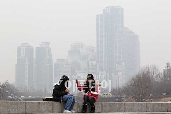 아침에 짙었던 안개가 차츰 옅어지고 있는 7일 오후 모처럼 포근한 날씨에 매헌초등학교 어린이들이 양재천에서 리코더를 불고 있다.