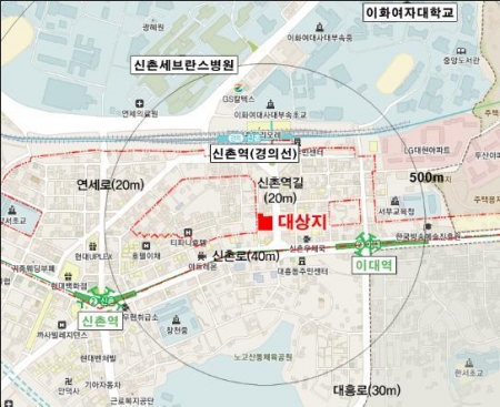 대상지는 신촌전철역의 집입로인 신촌역길(20m)의 가로변에 입지하며, 반경 500m내에 지하철 2호선 이대역과 신촌역 및 북측에 경의선 신촌역이 위치해 있다.