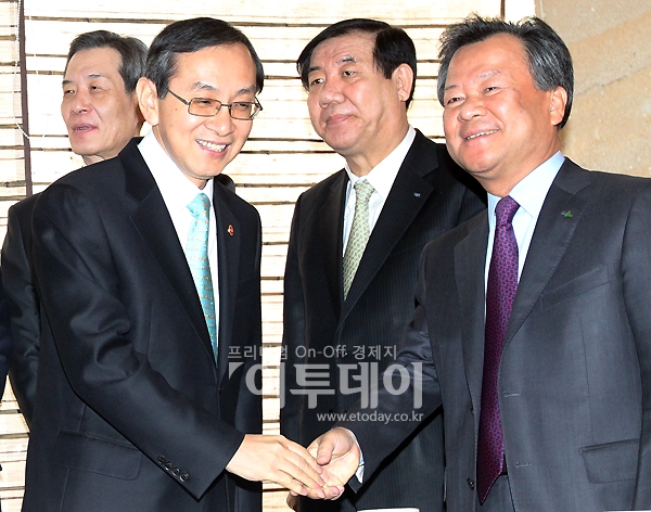 김동수 공정거래위원장이 10일 서울 팔래스호텔에서 건설업체대표들과 함께 동반성장 확산을 위한 간담회를 갖기 앞서 김중겸 현대건설 대표와 인사를 나누고 있다
