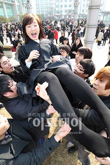 2010학년도 학위수여식이 열린 17일 오후 행당동 한양대학교에서 학위수여식을 마친 졸업생을 친구들이 헹가래치며 졸업을 축하하고 있다.