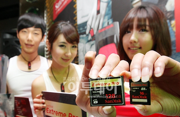 플래시 메모리카드 기업 샌디스크가 17일 오후 서울 마포구 서교동의 한 클럽에서 세계에서 가장 빠르고 고용량의 컴팩트플래시 카드를 선보였다. 오늘 발표한 샌디스크 익스트림 프로 CF카드는 128GB의 저장공간에 초당 최고 100MB의 쓰기 속도를 구현했다. SDHC 카드는 SD 3.0 사양의 UHS 기술을 적용 초당 최대 45M로 빠른 읽기와 쓰기 속도를 구현 최대 32GB의 저장용량을 자랑한다.