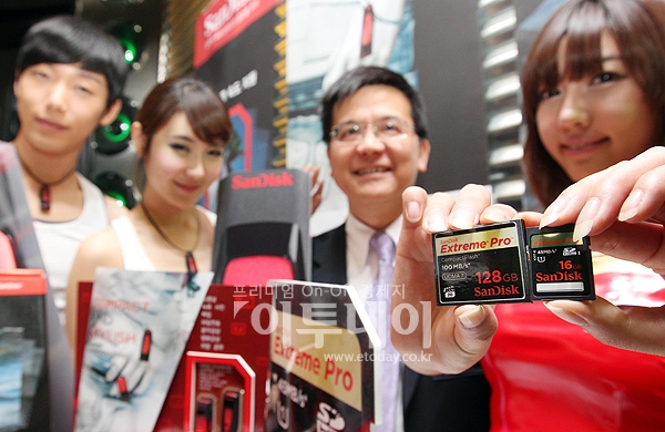 플래시 메모리카드 기업 샌디스크가 17일 오후 서울 마포구 서교동의 한 클럽에서 세계에서 가장 빠르고 고용량의 컴팩트플래시 카드를 선보였다. 오늘 발표한 샌디스크 익스트림 프로 CF카드는 128GB의 저장공간에 초당 최고 100MB의 쓰기 속도를 구현했다. SDHC 카드는 SD 3.0 사양의 UHS 기술을 적용 초당 최대 45M로 빠른 읽기와 쓰기 속도를 구현 최대 32GB의 저장용량을 자랑한다.